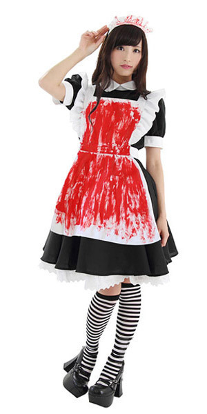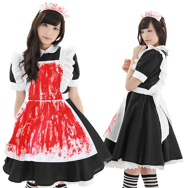 ホラーなお茶会へようこそ!血しぶきを浴びたようなメイドコスチューム。●ブラック×ホワイトの定番カラー●ふんわりAライン丸襟ワンピース●フリルたっぷりホワイトエプロン●フロントに血のような赤ペイント●ブリム付きカチューシャも付属。ハロウィンらしさ全開なホラーテイストのメイド服!返り血を浴びてしまったようなたっぷり赤ペイントがおどろおどろしいハロウィン衣装です。※靴下は付属しません。