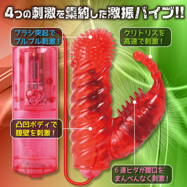 異なる4つの快感が集結!刺激的なユニークボディのコード付きバイブ。●膣壁:凸凹トルネードの螺旋刺激●膣奥:本体先端ブラシのブルブル刺激●クリトリス:連結玉の高速刺激●膣口:クリバイブ側面ヒダの連続刺激●強弱調整はスライド式。クリトリス、膣口、膣壁、膣奥へ同時に襲い掛かる激振動!4つの刺激が乱れ狂う刺激的なバイブレーターです。