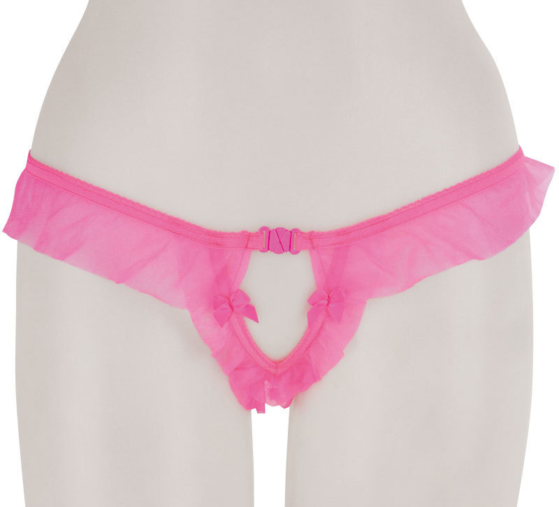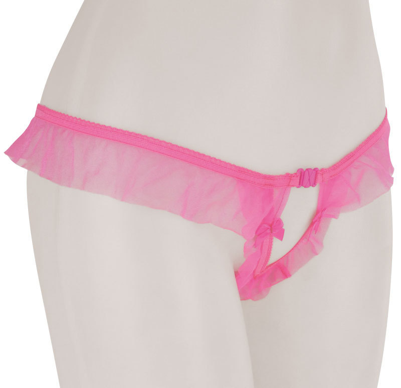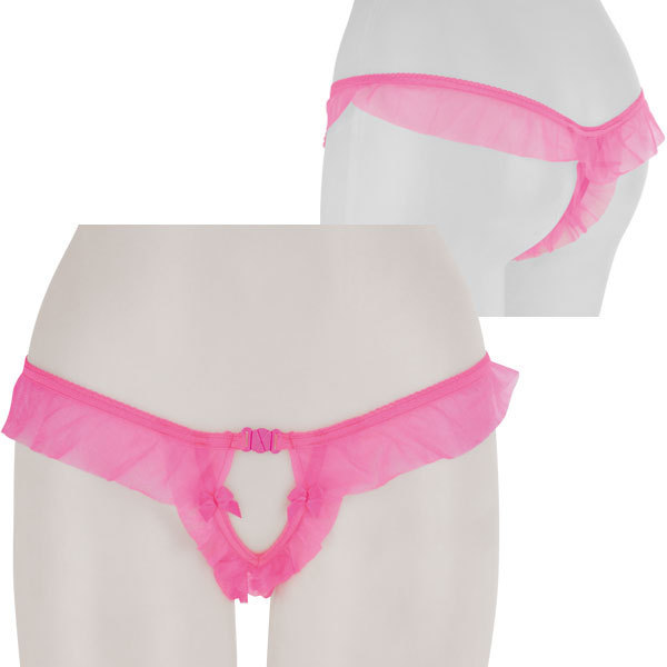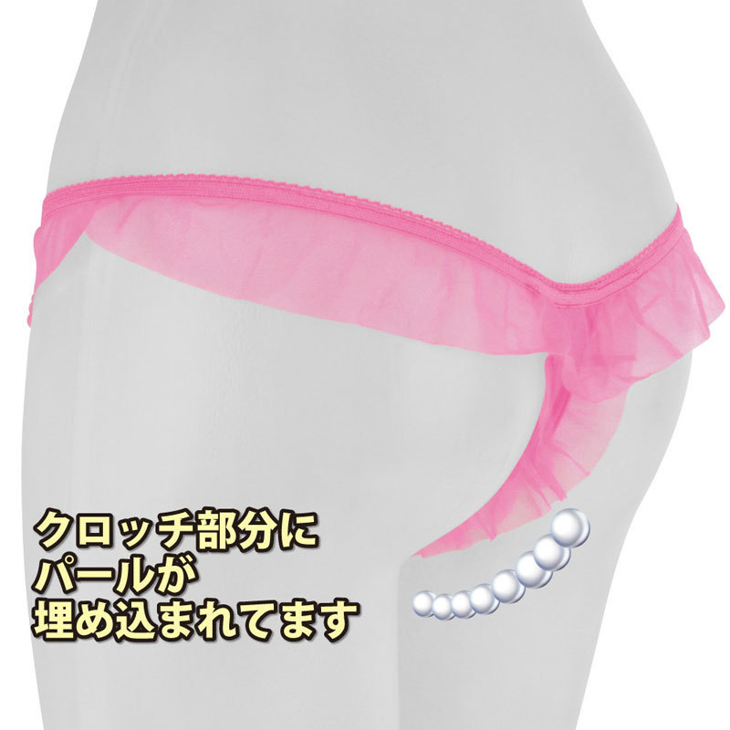 クロッチに大人の秘密♪ひらりと舞うピンクシースルーフリルのオープンショーツ。●ラブリーなピンクカラー●透け感を生かしたエアリーフリル●クロッチに大粒パールビーズを内蔵●セクシーなオープンカットデザイン●ちょこんとリボンで可愛さプラス●フロントホックで開閉も可。リボンやフリルといった愛らしいデザインとは裏腹に、連なるパールビーズを配したちょっぴり刺激的なランジェリー!フロントホックで着脱できたりと、遊び心がたっぷり詰まった大人のショーツです。