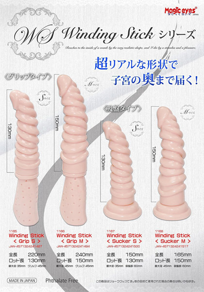 性欲の高い方におすすめなのが、こちらの「うねるディルド」です。この「ワインディングスティック」は、ピストンも奥突きも思いのままに楽しめるといううねる立体螺旋フォルムのグリップ式ディルド!膣奥をホンモノ以上の挿入感で刺激し、むっちり弾力のエラストマー素材と刺激的な凸凹スパイラル形状でかつてないほどに充足感を与えてくれます。こちらのグリップSタイプは初〜中級者の方に最適なサイズとなっていて、小ぶりな亀頭で挿入もしやすく先端のソリがぐりぐりとねじ込み、うねるような快感をお届けします!扱い易い持ち手が付いて、純日本製で安心。 |