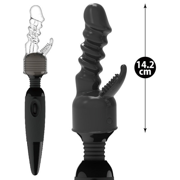 電マが二点責めバイブレーターに変身♪中と外から刺激できる電マ用アタッチメント。●パワーワンド(b24919)用アタッチメント●柔軟・耐久性に優れたエラストマー●逞しいブラックカラーのバイブ型●膣内・クリの2点責め形状●くっきりカリと螺旋の凸凹ボディ●びっしり突起でクリトリス責め。電マの強力振動+うねるフォルムが高刺激を生み出す電マ用アタッチメント!パワーワンドだけでなく、フェアリーミニ(k00003)などヘッドの直径が4.5〜5.2cmの電マに対応しています。