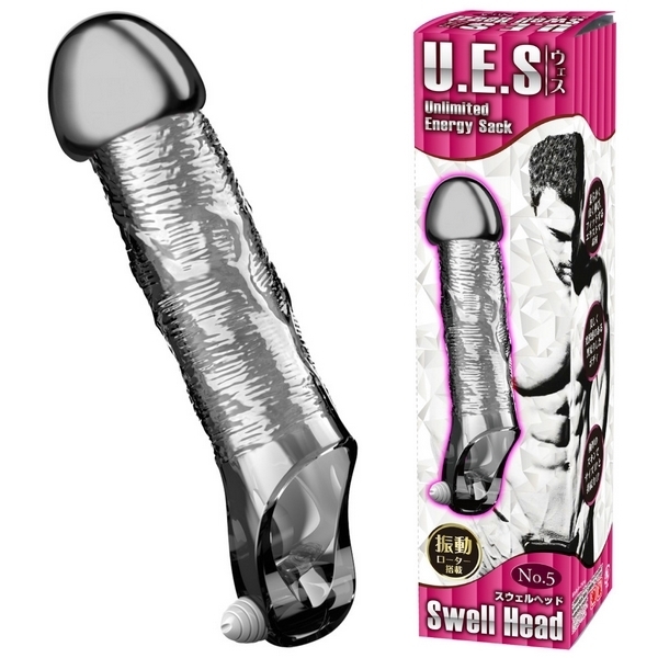 Wホールドでサイズアップ&ロングプレイ!大きめヘッドの極厚ペニスサック「UES(ウエス)5 スウェルヘッド」。●オールカバーの電動サック●先端が大きく膨らんだ「No.5」●全長15.5cm、亀頭部3.3φcm●大きめ先端の黒光りボディ●極厚仕様のエラストマー素材●伸縮素材でしっかりフィット●根元を締め付ける玉袋用の穴●玉袋裏側にミニローター付属。ぷっくりと盛り上がった大きめヘッドで高刺激なファーストインパクトを!極厚スキンで竿全体+玉袋をガッツリ締め付けて持久力を高めながら、振動快感も得られる男性補助グッズ。付属のローターは取り外し可能ですが、電池交換不可の使い切りタイプです。 |