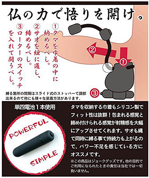 男の快感を助太刀!ループタイデザインのペニスリングと玉袋を包むシリコン巾着を一体化させた男性用補助グッズ「SUKEDACHINAWA(スケダチナワ)仏」。●伸縮性のあるシリコンタイ●スライド式で簡単に調整可●すっぽり包む玉袋用の巾着●シリコンでフィット感抜群●締め付け+包まれるW快感●内蔵ローターでさらに刺激●簡単操作のワンタッチ電源●ローターは着脱可能。仏の力で悟りを開く!玉袋を包み込みながら締め付け&振動刺激も楽しめる男性用補助グッズ。玉袋をシリコン巾着の中に納めてからサオを縄に通して縛り、ローターのスイッチをON!締め付けによる持久力UPだけでなく、玉袋を包んで振動を与えることで射精感も大幅にUP!快感もパワー不足もアシストしてくれるマルチなアイテムです。 |
