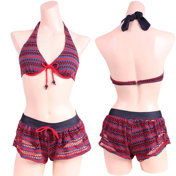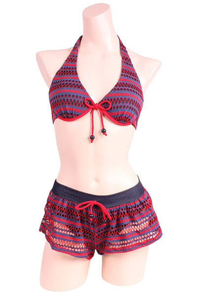 ビーチで周りと差をつける、赤とネイビー本格スイムウェアシリーズ♪ショートパンツありなしで2テイスト楽しめる3点セット。気分でフレキシブルに着替える事が出来る優れもの。デニム風合いのストレッチ生地と2色使いのネットボーダー生地を重ねてレディだけどカジュアルなバランスが素敵。パイピングとチャームのアクセントも絶妙です。※こちらの商品は受注発注商品の為、ご注文から発送までに3、4営業日掛かる場合が御座います。