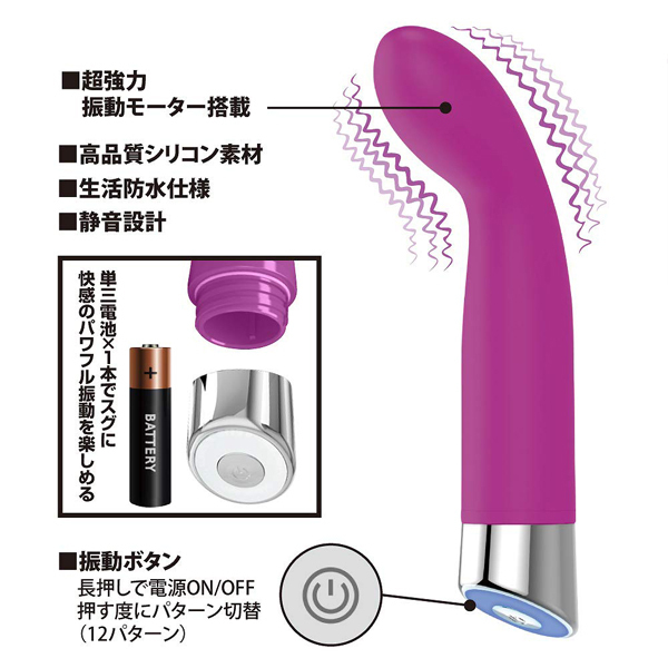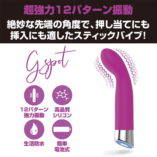 ポケットサイズに高性能&高品質をつめこんだスティックバイブレーター。絶妙な先端の角度でGスポットを押し上げ、快感震動が直撃!滑らかで優しい質感のシリコンボディは押し当てにも適してます♪●12パターン強力震動●高品質シリコン●生活防水●電池別売