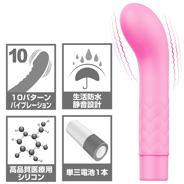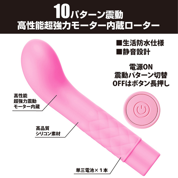高性能な超強力モーターを搭載!女性の気持ちいいを追求する「プリティラブ」シリーズよりGスポ責めに特化した電池式スティックバイブ(ピンク)。単3電池×1本とボタン1つのシンプル操作で10パターンもの強力振動♪ポコッと出っ張った先端がGスポを直撃、強い快感が貴女をイキ狂わせる!素材には医療で使用される肌に優しいメディカルグレードシリコンを採用。生活防水&静音設計