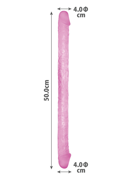 1人で二穴挿入できる♪浮き立つ血管とカリが興奮を誘う長さ約50cmの双頭ディルド。心地よい挿入感を生み出す程よい弾力と、2箇所同時に挿入可能な柔軟性の高さが貴方を満たす!この病みつき質感にもうヤミツキ♪一人は勿論、カップルさんのプレイに是非どうぞ。両先端同じ大きさ(4cm)