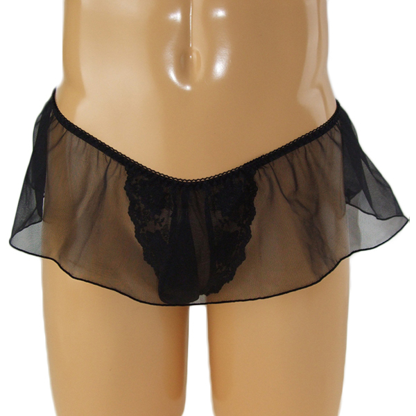 揺れるレースがエレガント!可愛いが好きな男性のための日本製レーススカート付Tバック(黒)。動くたびユラユラ揺れる極薄生地が美しくもエロティックなデザイン!レース生地から透けて見えるレース刺繍のTバックもまたセクシーな一枚です。女装下着用にぜひどうぞ!