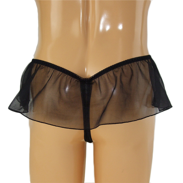 メンズ シースルースカート付きレース刺繍Tバック (ブラック)