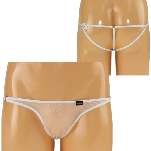 キラキラとした極薄シースルー生地で大胆に魅せるメンズ用オープンショーツ(白)。背面は3本の紐のみで仕立てたオープン仕様で、スケスケの生地と紐をメタルリングでジョイント!ヌードよりもセクシーに決まる日本製オープンショーツ。
