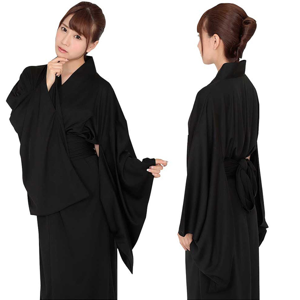 着るだけで哀愁漂う未亡人になりきれる和装コスチューム。黒の着物と同色の帯紐のセット!ハロウィン仮装にも最適な着物コスプレ。
