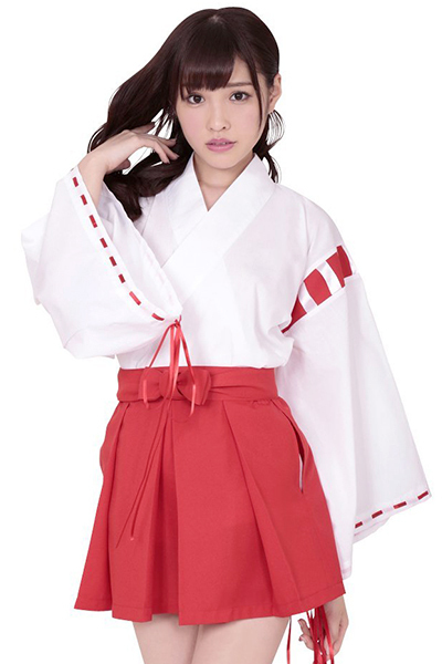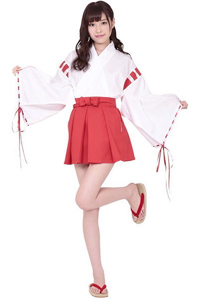 大人気の巫女さんコスプレに大きめサイズが登場!白の着物に赤のパイピングがアクセントになった巫女コスプレ。袴風のミニ丈スカートが可愛い!コスプレイベントほか、忘年会や年末年始の衣装に◎