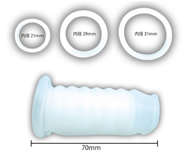 パッケージ:19.5×12.3×4.0cm 本体:スリーブ全長7.0cm・リング内径(小2.1cm・中2.9cm・大3.1cm)