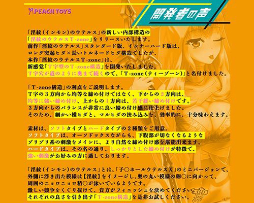 T字型フォルムが特徴の「淫紋のウテルス」シリーズ第2弾!ピタッと密着して程よく締め付ける非貫通型オナホ(日本製)。壁一面にびっしりと配置されたヒダを亀頭や裏スジで感じながら、T-zone構造の極狭道の締め付けを2段構えで体感!小さめながらも快感たっぷりに仕上がっています。ギュギュっと締め付ける強烈刺激のハードタイプ