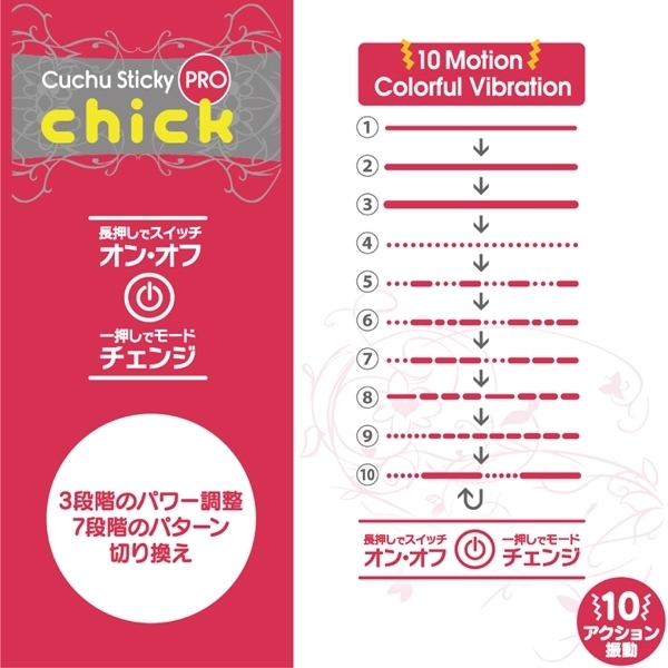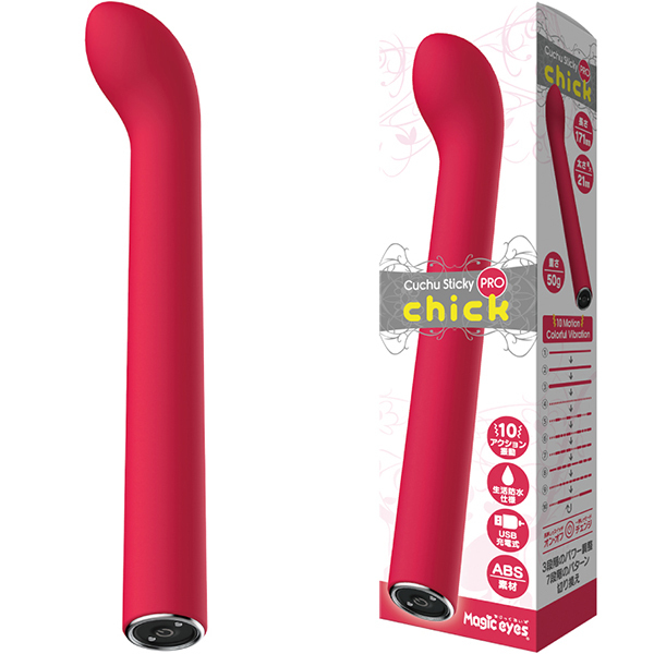 USB充電式なので電池交換の煩わしさもなく、Gスポット等の敏感な場所にもピンポイントで届く絶妙なサイズ感が嬉しいクチュスティッキーChickです。10モードもの振動パターンの中から自分の好みを選ぶことが出来、生活防水設計を搭載しているのでメンテナンスもカンタン♪マグネット式の充電用USBケーブルが付属しているのでご家庭の環境で届いたらすぐに充電が可能です。操作方法も簡単で電源スイッチの長押しでオン・オフができます!クリムゾンマットコーティングのボディは長さ171mmと十分なサイズ、太さ21mmは太すぎず、重さは50gと軽量なので、どなたでも気軽にお使いいただけます。 |