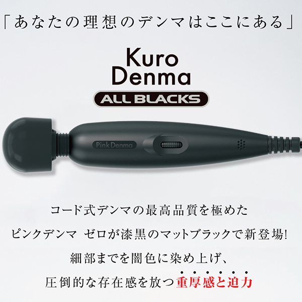 黒デンマの最高峰が登場しました!「絶対イカせるデンマ」クロデンマオールブラックスです。高級なマットブラックから醸し出される圧倒的な重厚感と存在感♪人気、実力ともにナンバーワンのピンクデンマゼロで実証された高性能デンマが黒の歴史を塗り替える!高級感と高性能を併せ持った黒い電マ♪延長コードが不要な3.5mロングコード!寝落ちもできる長時間の連続稼働と柔らかなコードガードで断線防止も。芯まで届くハイパワーをぜひお楽しみください♪