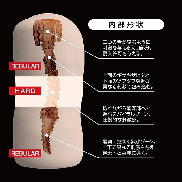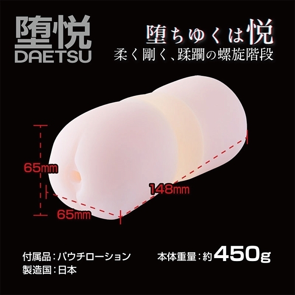 堕悦は硬度の異なる二つの素材を三層に配置し、柔・硬・柔の挿入感を実現しました。絹の様な柔らかい感触と、しっかりと刺激を与えるハードな感触が交互に訪れます。また内部構造は二つの舌が絡みつく入り口部分。上下で異なる感触面を通過し、捻れるヒダを通過する中間部。狭小の壁面でしっかりと包み込む最奥部。これらは快感を高めるために考えられた構造になっています。