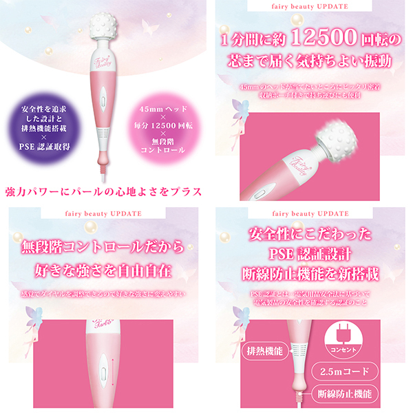 フェアリーシリーズのハイスペックモデル「フェアリービューティ」がアップデートして登場♪パールヘッド仕様でやさしい肌あたりと心地よさを実現♪毎分12,500回転の強力振動でしっかりサポートします!無段階コントロール機能によりお好みの強さに調整可能♪排熱機能を搭載し長時間でも快適な使用感をキープします!断線防止機能つきでコードの耐久性もアップ♪PSE認証取得済みで安全性も抜群です!2.5mのロングコードで取り回しもスムーズ♪使いやすさと機能性を兼ね備えた1台です!収納ポーチ付きで保管や持ち運びにも便利♪毎日のケアタイムに活躍するハンディマッサージャーです! |