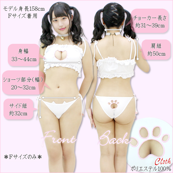 キミのために可愛くなるにゃん♪男女問わずハートを射止めるキュートな猫モチーフの水着が登場しました!フリル×猫のコラボレーション!ブラやショーツに所々取り入れられたネコが乙女心をくすぐります♪さらに後ろで留めるタイプの鈴つきチョーカーも付属。別途で猫耳カチューシャや尻尾を取り入れれば、気持ちは擬人化した猫の気分!?自宅でハロウィンパーティを開くならセクシーな仮装コスチュームとして使えますし、他にも自分へのご褒美や彼へのサプライズ演出にも是非どうぞ♪※水洗い可、塩素系漂白剤による漂白不可、アイロンは中温で当て布使用、ドライクリーニング可、色落ちの可能性があります。 |
