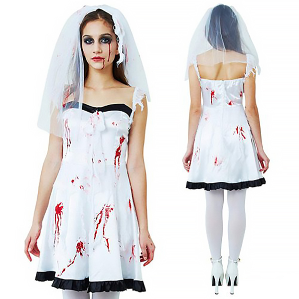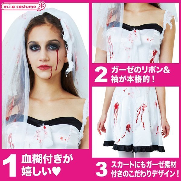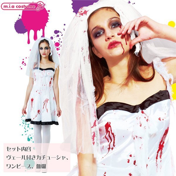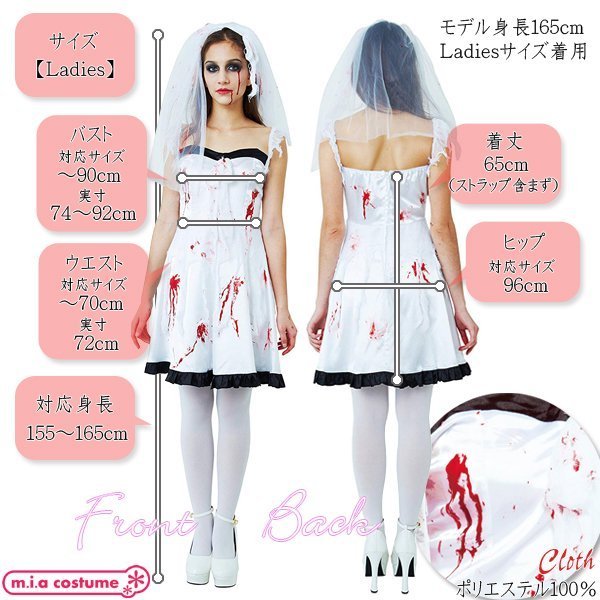 血まみれで恐怖の結婚式!血だらけの花嫁コスプレです♪ゾンビ・ホラー系の仮装コスチュームとして、ハロウィンパレードやお化け屋敷、仮装イベントにどうぞ!ウェディングドレス風の衣装で血糊はお好みでアレンジ♪ハロウィンのコスプレにもぴったりです。※商品写真は参考例として血糊でアレンジ後の画像となりますので、ご注意ください。※水洗い不可、塩素系漂白剤による漂白不可、アイロンは低温で当て布使用、ドライクリーニング不可、色落ちの可能性があります。※商品写真は参考例として血糊でアレンジ後の画像となりますので、ご注意ください。※こちらの商品は在庫の状況によりお届けまでに4日〜7日程度かかる場合がございます。 |