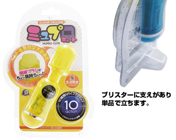 ノーマル&ブラシの2WAYヘッド仕様!小さいながらも多機能なミニ電マ(クリアイエロー)。汚れにくいマットコーティングのシリコンヘッドは、女性に優しい柔らかなタッチを実現!そのキュートなボディとは裏腹に、10パターンの強力バイブレーションを搭載!ノーマルで押し当てたり、ヘッドを外してブラシでのピンポイント刺激も可能!さらに、表示部にはLEDバックライトも搭載しています。お手入れの簡単な生活防水仕様の電マ型ローターです。ボタン電池(LR44)×6個使用。