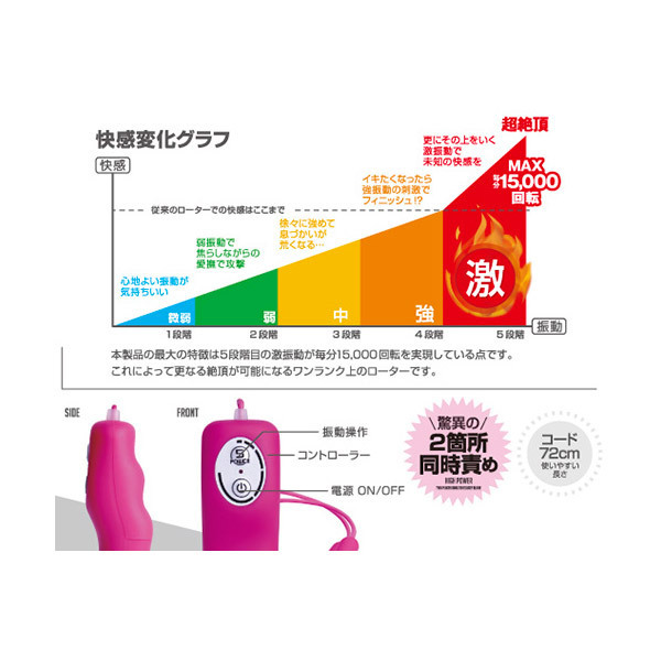 MAX15000回転!驚異の高速回転が敏感な箇所を容赦なく責める、究極のダブルローター「ビブラル ツイン ピンク」(生活防水仕様)です。ボタンひとつで選べる、ハイパワーな5種類の振動を搭載!また、ローター部分は強力振動を与えても痺れにくいシリコングリップ付きなので安心して使用できます。シンプルな見た目からは想像つかないほどの刺激&快感を与えるアイテムです。単四電池×2本使用。
