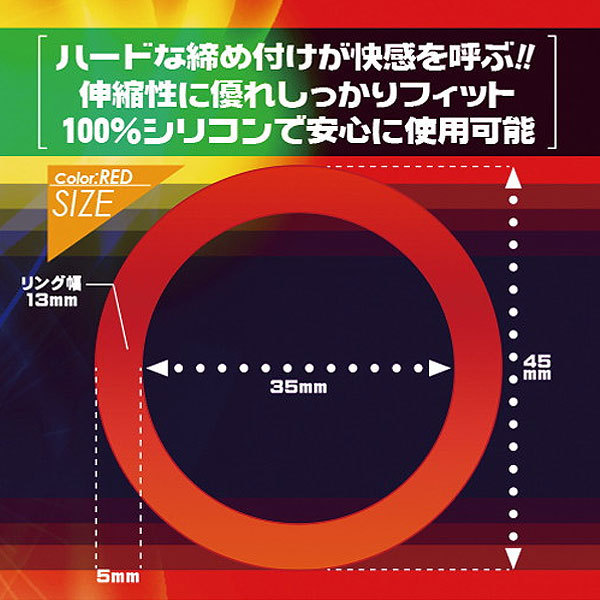 熱い夜を制する為の男の強い味方!幅広リングで強力にサポートする、シリコン製コックリング。内径35mmで竿と袋の根元をググッと締め付け可能!勃起力をUPさせながら持続力を高め、男らしい夜を演出してくれます。100%シリコンによる伸縮が男性器に絶妙にフィット!パワフルでたくましい夜の王者になれるコックリングです。