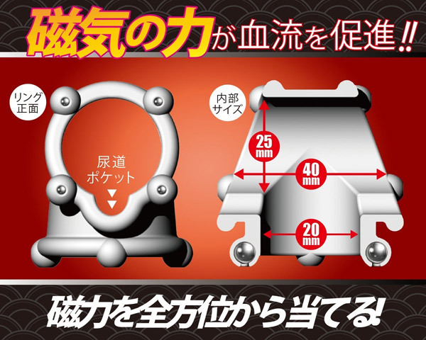 磁気の力で硬さをキープ!磁気ボール内蔵コックリング「JIKIMARU-磁気丸-」。●『力丸』シリーズの磁気タイプ●竿と玉袋をがっちりとホールド●12個の磁気ボールを各所に内蔵●全方向からの磁力で血流を促進。ホールド感が特徴の男性用サポートグッズ『力丸』シリーズに磁気タイプが登場!プレイ時だけでなく、普段から使用することでより高い効果を期待できます。