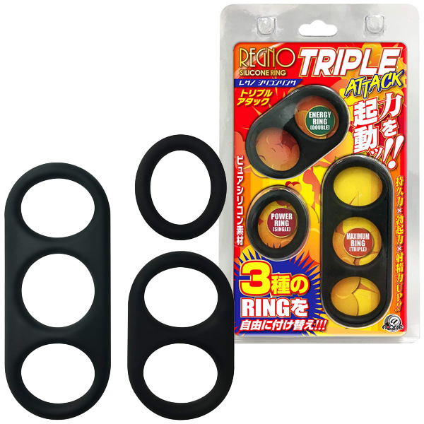 持久力×勃起力×射精力UP!3種類のリングを自由に付け替えてSEXや自分磨きに使える「レグノシリコンリング」(トリプルアタック)。商品内容はドーナツ型のシングルタイプと2点締めのダブルタイプ、そして3点締めのトリプルタイムと3種類のリングがセット!適度な柔軟性と締め付けが期待できる素材はピュアシリコン製。フィット感が強くしっかりした締め付けができるのが特徴!SEXや自分磨き、付け方次第で攻守ともにシーンを選ばず力を発揮♪その日の気分や体調によって付け替えたりと、使い勝手は抜群です。