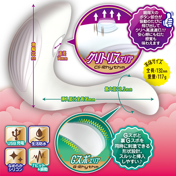 クリオナ革命はじまる!クリトリスにトントン叩く愛撫を!クリ吸引とは違ったキモチよさをエーワンからお届け♪これからは連打の愛撫(クリリズム)でキモチよくなろう♪<クリトリスエリア(クリリズム)>親指大のボタンがクリを高速連打。ゆっくり心地よい連打から超高速連打までの7ヒット。<Gスポエリア(Gリズム)>フレキシブルに曲がり、こぶりで挿入しやすい設計。裏Gスポも合わせて刺激する7振動。なめらかなシリコンコーティングで、白鳥みたいな形がクリとGスポにフィット。遠隔操作できるオシャレなリモコン付き。※クリトリスエリアとGスポエリアの振動は連動しており個別には選べません。※リモコンでは振動のON/OFFはできません、本体でON/OFFを行ってください。充電時間:約150分/連続使用時間:約60分(使用状況や環境により時間が変わる場合があります) |