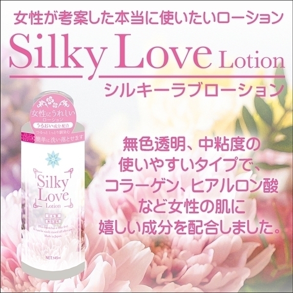 「肌になじみやすい」「潤い・保湿が欲しい」「コスパ高がいい」etc.そんなユーザーの想いを実現するために女性が考案したのがシルキーラブローション。コラーゲンやヒアルロン酸など肌に嬉しいうるおい成分に加えホホバ油を配合することでお肌へすっとなじむ仕上がりに。カキタンニンによる消臭効果も期待でき、さらに使用後は簡単に洗い落とすことができます。本当に必要な成分・性能を厳選した無色透明の中粘度ローションです。<成分>精製水、グリセリン、PG、カルボマー、EDTA-2Na、フェノキシエタノール、カキタンニン、アルギニン、キサンタンガム、ホホバ油、ヒアルロン酸Na、水銀化コラーゲン、ザクロエキス、ローズウォーター、水銀化Na |