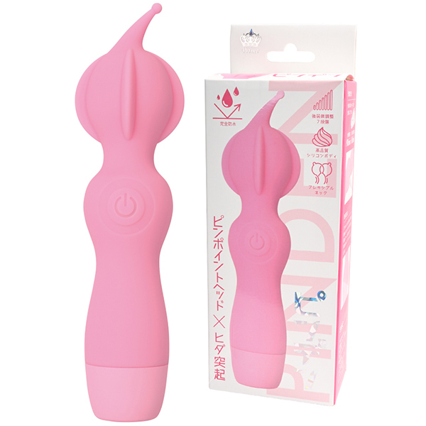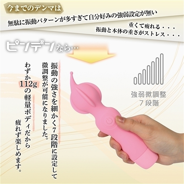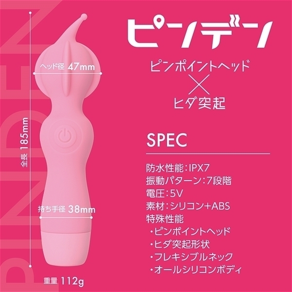 ピンポイントヘッド・ヒダ突起付の完全防水シリコンデンマです。上質振動の強力モーター搭載・高品質シリコンボディ・フレキシブルネックの上級性能に加えてピンポイントを強力刺激出来る先端突起と割れ目に入れて楽しめるヒダ突起形状をプラスしました。振動も一般的なパターン振動では無く、こだわりの強弱微調整可能な7段階振動です。もちろん普通のデンマスタイルも可能なので色々な楽しみ方が出来ます。しかもIPX7の完全防水性能だから使い勝手もバツグンです。90分満充電で60分使用可能(使用環境により大幅に増減します)なリチウムイオン電池内蔵。パワフルなのに繊細な使い方も楽しめるデンマです。●カラー:ピンク |