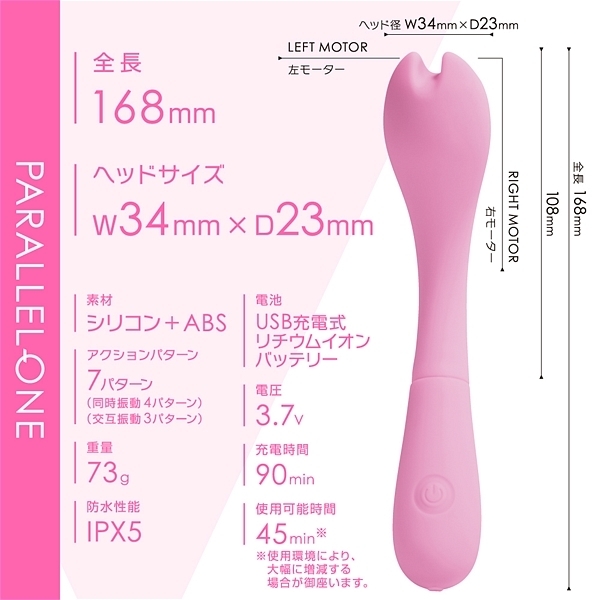 先端に並列で2つのモーターを搭載して、個別に振動させる事が出来るツインモータースティックです。滑らかな肌心地のシリコン素材と振動の質にこだわったモーターを2機搭載。プレジャースポットに合わせた角度と日本人に合ったサイズ感が特徴です。先端は挟んで刺激も出来るように溝を付けています。先端振動は同時振動・個別振動合わせて7パターン。90分充電で最大45分使用可能(使用環境により大幅に増減します)なパワフルなリチウムイオンバッテリーを搭載。IPX5の高レベル防水でしっかり洗えて衛生的です。スマートに振動を楽しめるWモーターヘッドスティックです。●カラー:ピンク |