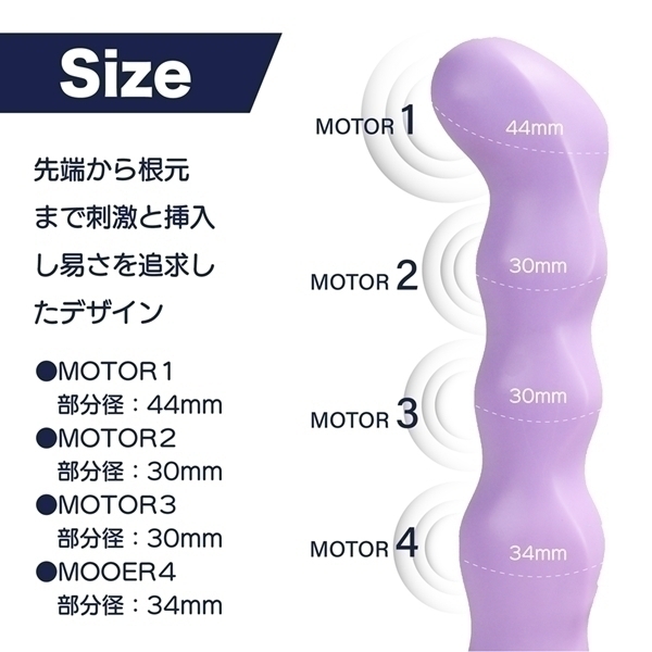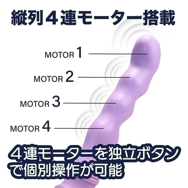 4つのモーターを搭載したハイパフォーマンスモデルです♪先端から根元まで並んだモーターは、それぞれ個別に細かく操作が可能!3段階の振動強弱と5種類のパターン振動を自由に組み合わせて、お好みのリズムを作り出せます♪先端を強めに、根元をリズミカルに設定するなど、多彩な楽しみ方ができます!さらに特別なCLIMAXボタンを押せば、全モーター振動や順番に波打つようなウェーブ振動など、4種類の特別なモードを楽しめます♪表面にはやわらかさと滑らかさを追求した特殊TPE素材を採用!手になじむ自然なフィット感が魅力です♪充電時間は約60分、最大90分の使用が可能! |