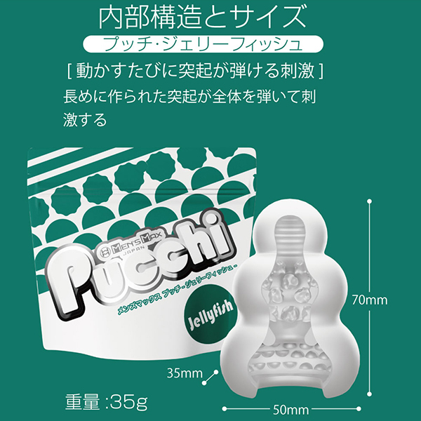 全てが新しくなったプッチ。ポケットサイズのローション不要ホールプッチシリーズが生まれ変わって新登場。軟性素材から内部の構造、パッケージ、全てが新しくなりました。デコボコ感、さらにクッキリ。今回新たに導入した「HD(High Definition)成形」で突起のデコボコ感がさらにクッキリになりました。突起に触れたときの粒立ちが違います。弾力感、さらにモッチリ。「HD 成形」により軟性樹脂の弾力性も向上。さらにモッチモチに、しなやかな素材になりました。内部構造も、さらにハッキリ。オリジナルシリーズ、スイーツシリーズ計8種類の内部構造をより精密な造形にリニューアル。「HD 成形」とあいまってデコボコ感がよりハッキリわかる構造になりました。生産工場を一新。新型プッチシリーズは日本国内に新設した工場から生産。最新の設備と厳密な品質管理で一つ一つ丁寧に作ります。ローション不要、必要なのは水だけ。ローション不要軟性素材「プラスウェッチ」水分が付着すると潤い成分が反応、ねっとりした潤いに包まれます。<ジェリーフィッシュ内部構造>「動かすたびに突起が弾ける刺激」長めに作られた突起が全体を弾いて刺激する |