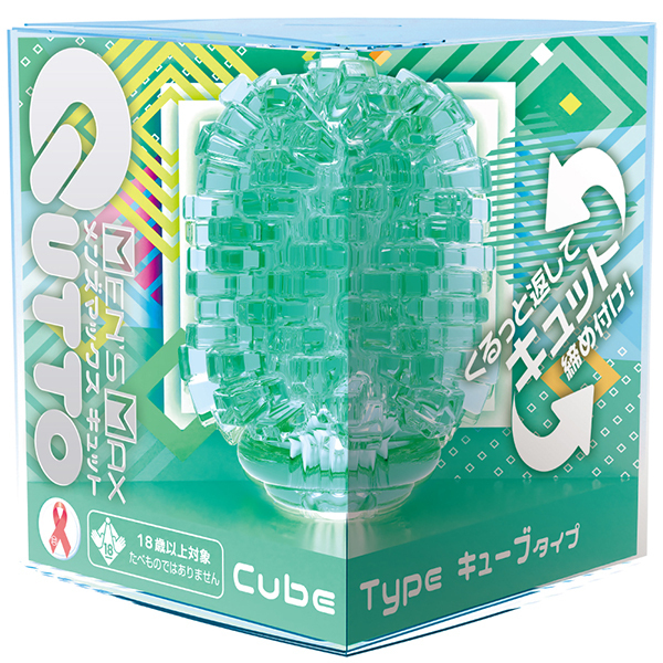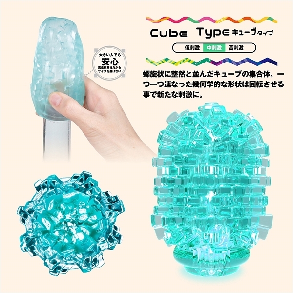 大粒デコボコ刺激がキュット締めつけ!裏返す事で未知なる体験と利便機能を持った変化する密集体ホール。「Qutto−キュット−」は従来よりも突起が大きく、肉厚になった大粒のデコボコ刺激を搭載。使用時に本体の凹凸面を内側に返すことで、内側に向かって大粒のデコボコ刺激が密集。キュット締めつけることで、「未確認の触感」を体験することができます。キューブタイプは、螺旋状に整然と並んだキューブの集合体。一つ一つ連なった幾何学的な形状は回転させる事で新たな刺激に。この商品には個装のローションが付属しています。