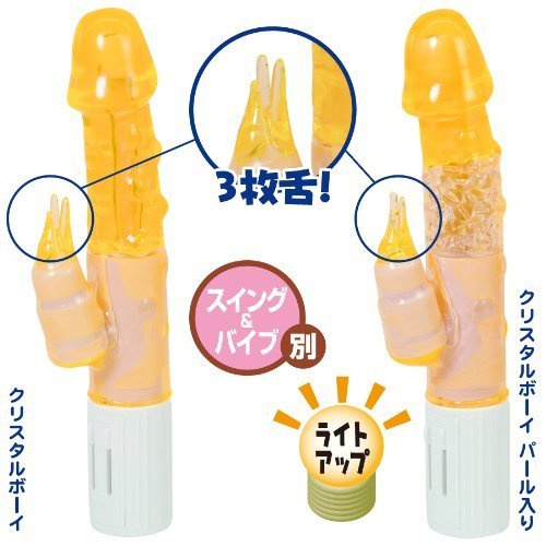 人間工学に基づいた昇天必須の快感バイブ「クリスタルボーイパール入り ブルー」。本体内部に贅沢なパールを内蔵し、使用時にはその部分が怪しくライトアップ!カリの直径約3.8cmと巨根マニアの方も納得!子機も3枚舌仕様と抜かりなし!さらにスイングとバイブの個別動作が可能…と、見た目と性能どちらも兼ね備えた次世代バイブ!