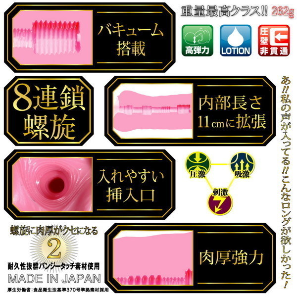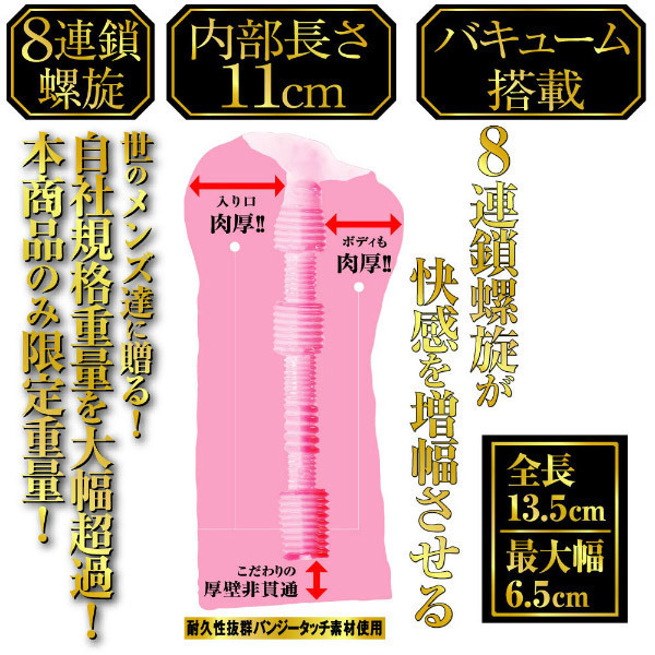 さらにパワーアップして登場!むっちり肉厚オナホールの第2弾「螺旋に肉厚がクセになる2」非貫通型。前作同様、バンジータッチ素材を採用したボディは、内部の長さを11cmに延長しました!内部構造はゾリゾリとした8連鎖のヒダ螺旋!ぎゅぎゅっと締め付けるバキューム力の増した「ずっ尻」オナホールで、クセになる快感をお楽しみ下さい。