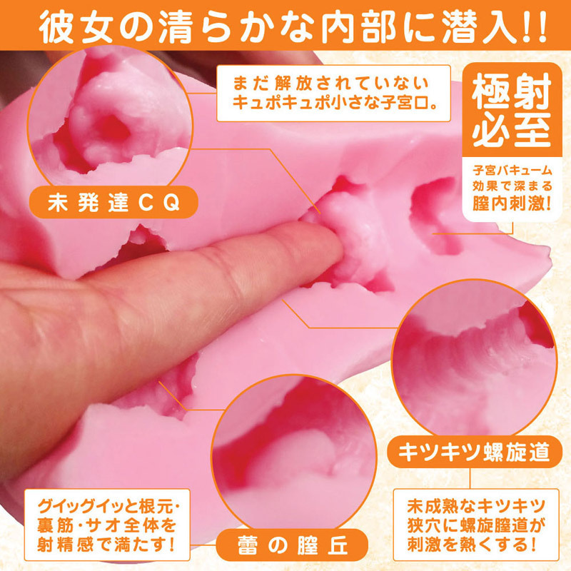 「ロリCQ」は、キツキツの子宮(CQ)を再現したオナホールで、キツキツのCQが好きな方におすすめです♪挿入直後に未発達の膣丘が感じられ、内部でしっかりと締めつけてくれます。奥に進むと、未成熟なキツキツ狭穴に螺旋膣道が刺激的な快感を与えます!サイズは平均的なハンドホールと同程度で、ボリュームも300gほどの肉厚さがあり、素材はバンジータッチで、べたつきやにおいはありません♪肉厚で柔らかい弾力が特徴です。最深部手前には小さな未解放の子宮口があり、最深部にはバキューム効果を持つエアポケットを採用!しっかりと締めつけて強力なバキュームで吸い上げてくれるため、最後の一滴まで快感を存分に味わえます。未経験の少女への挿入感をたっぷりと楽しんでください♪ |