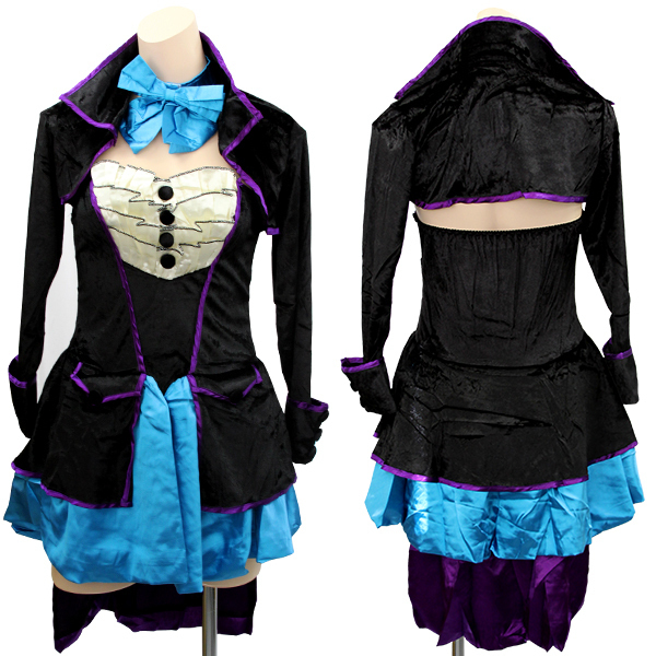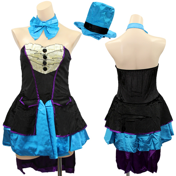 異素材コンビで大人の雰囲気に♪セクシークールなマジシャン風のコスプレ衣装。パープルカラーのパイピングを差し色にした黒ベロア素材と、光沢ブルーサテンの異素材で仕上げたベアトップデザインのミニワンピース!胸元は4段フリルで飾って可愛らしさもしっかり!スカート後ろのテール部分は縫い付けです。ワンピとお揃いベロア素材のミニ丈ボレロは、カフス付きの長袖仕様!サテンのマジシャンハットとビッグなリボンもセットです。※セット内容以外は付属しておりません。
