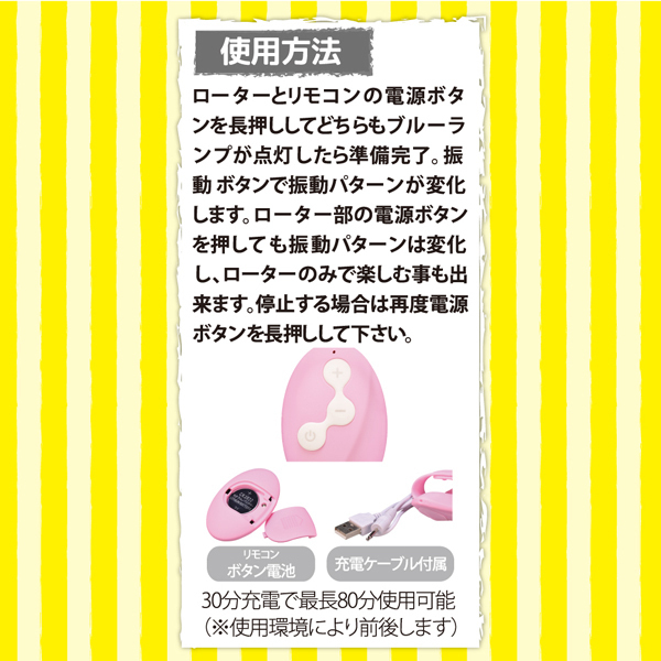 ショーツや指に固定して使えるベルト付きのUSB充電式ワイヤレスローター。10種類の振動アクション×最大8mの遠隔操作機能を搭載!肌触り滑らかなプレミアムマットシリコン素材を採用でIPX7の完全防水製。ローターにもスイッチが付いているため、単体での使用も可能!1人は勿論、パートナーと一緒に遊んで楽しもう♪リモコンはボタン電池を1個使用 |