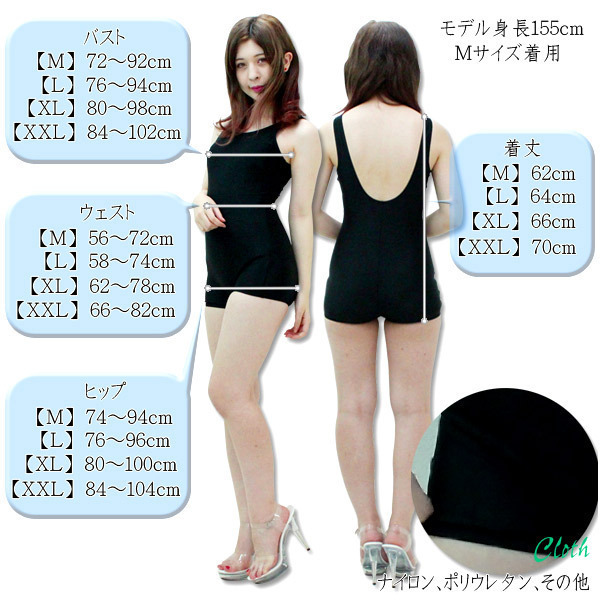 XXLサイズ:B84〜102cm・W66〜82cm・H84〜104cm 着丈70cm セット内容:水着単品(前身頃全面に裏地付き、胸部にパット付き) 素材:ナイロン、ポリウレタン、その他