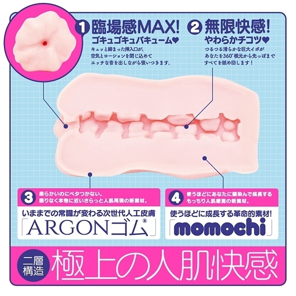 限りなく本物の肌と質感を追求した次世代人工皮膚素材を使用!いままでの常識が変わる次世代人工皮膚素材「ARGON(アルゴン)」を使用した非貫通オナホ「次世代HOLE XYZ 人工皮膚」です♪計算された内部構造にローションと空気の黄金比!極上の「ギュポギュポ」する吸い付きと挿れ心地は絶品です♪外層は柔らかいのにベタつかないさらっとした人肌再現の新素材を使用!内層は使うほどに成長する革命的素材「momochi」を使用することで、使えば使うほどにあなたに馴染んで成長するもっちり人肌感覚がたまりません♪劣化しずらい高い耐久性や弾力性も魅力的!2層構造が極上の人肌快感とキュッと締まった挿入口、そしてストロークの度にエッチなギュポ音を発する使用感が聴覚からもイキを誘発してくれそうです♪素材は安心の国産素材&国内生産。パッケージイラストは人気絵師「ぴょん吉」氏を起用。 |