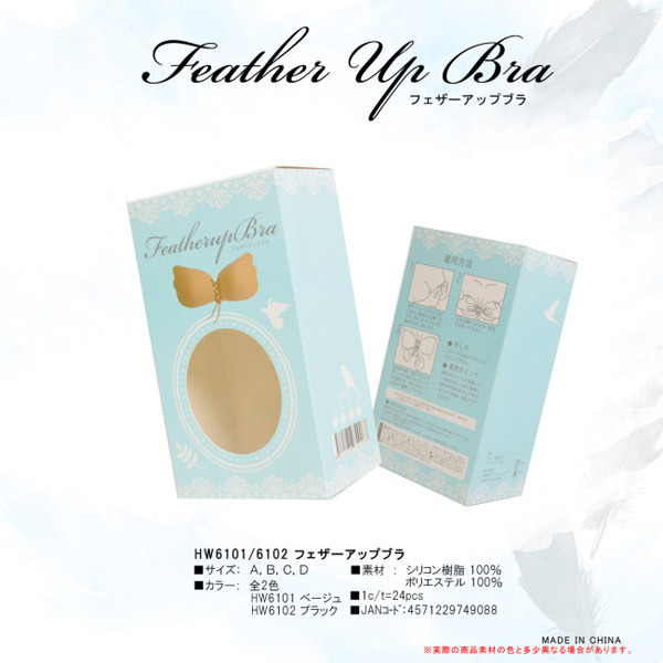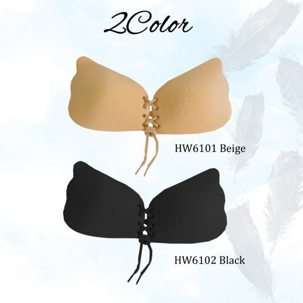 寄せて上げて谷間もメイク♪天使の羽型シリコンブラ「フェザーアップブラ ブラックB」。羽のようなカップがボディに馴染みやすいブラックカラーのモールドブラ!カップ内側は粘着シリコン樹脂、外側はサラリとした肌触りのポリエステル素材です。中央はアジャスターで自在に調整できる編み上げ仕様!胸のボリュームを強調したい場合は少し上目で着用し、紐を持って留め具を上下させるだけで自由に谷間をメイク出来ます。【着用方法】両手でカップを外に向けて反らし、最適な位置にあわせてから外に反ったカップを胸の方向に戻して、ふちが胸につくように指先でなぞって下さい。左右着用後、両手でカップをしっかり押さえて定着させ、留め具をスライドしてお好みで調整して下さい。粘着効果が薄れた際は、一度水洗いし乾燥させてから再度着用して下さい。※サイズは画像を参考にお選びください※通常よりワンサイズ小さめが綺麗に着用できる目安です※Aサイズ(h00036)もございます |