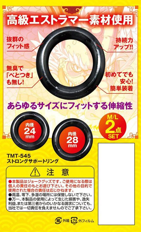 φ24mmとφ28mmの2個入り!装飾無し、シンプルで使いやすい黒いエラストマー製コックリング。フィット感よし!ペニスの根元を締め付け、早漏予防や勃起補助として使うコックリングです。海綿体に血液を留めて早々に果てるのを防ぎながら、いつもより勃起をキープして感度も上げる優れもの!ベトツキが少なく伸縮性に富み、装着も簡単。イザという時の男の味方です。●メーカー型番:TMT-545