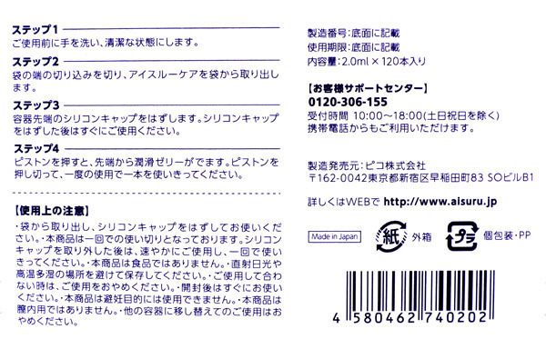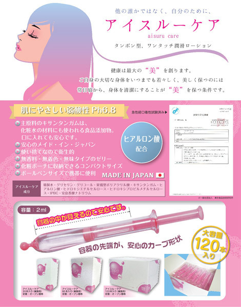 まとめ買いにも便利な業務用120本入り!潤い不足で悩む女性の為の潤滑ローション。●ワンタッチで注入できる注射器タイプ●一回使い切りの個包装で衛生的●自然に潤う無香料・無着色●身体にやさしい成分を配合した弱酸性。注射器型のプラスチック容器だから、手を汚さず注入できてとっても衛生的。口に入れても大丈夫な無味無臭で、安心してお使い頂ける日本製の潤滑ゼリーです。