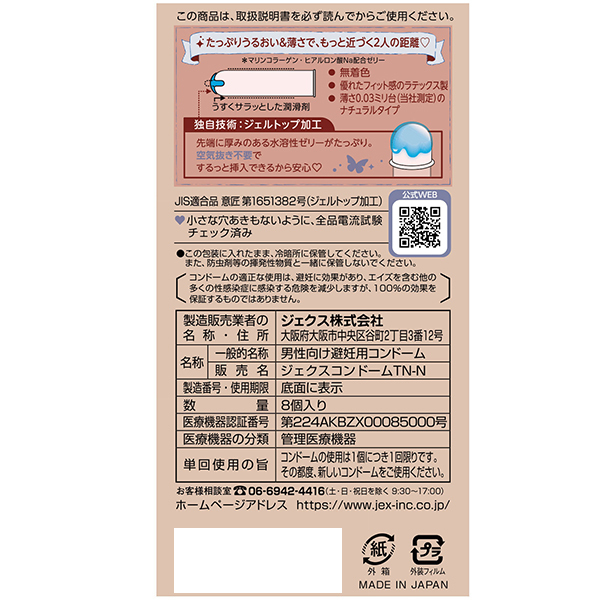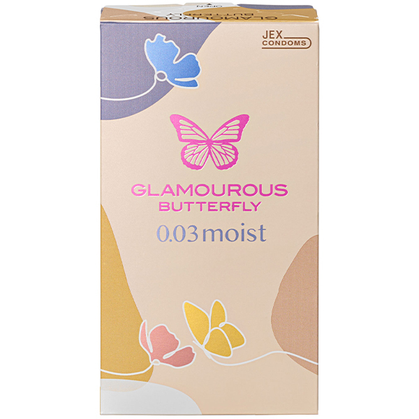 女性から定評のあるグラマラスバタフライより、モイストジェルが塗布された天然ラテックス製0.03mm厚のコンドームが登場!中へ入れると膣内部で徐々に温かさが伝わり気持ちいい♪パッケージデザインは一見アダルトなアイテムには見えないオシャレさで、ゴムの裏表が分かりやすくデザインされてあるところも嬉しいポイント!見た目だけでなく、挿入感や使用感など機能面でもこだわりたい女性に。※リニューアルに伴いデザイン、入り数(10個入りから8個入りに変更)が画像と異なる場合が御座います。