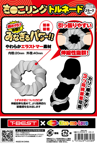 <T-BEST×KISS-ME-LOVE>夜もがんばリングで大人気のやわらかメンズリング「ち●こリング」が、トルネードになって新登場!今度のち●こリングは「特殊形状3個セット」!トルネードデザインのリングを3つもセットにしました!うずまき状に巻き付いた凹凸が伸縮率を高めてより効率的な装着感を生み出します。合わせて使えば三点同時装着が可能となります!高い耐久性のやわらかエラストマー素材に引っ張りやすい簡単装着デザイン男らしさを引き立たせるスモークカラー!締め付け抜群みなぎるパワー!