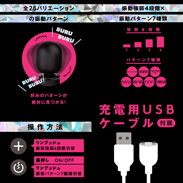 コンパクトなボディで女性でも持ちやすい♪絶対にイケる王道デンマ「完全防水 超愛振動 DENMA 28 black」です。押し当てても痛みが少ない柔らかなソフトシリコン素材を使用♪全28パターンの多彩な振動バリエーションで優しい刺激から壊れちゃう刺激まで全部楽しめます。ふんわりサラサラで優しい肌触りにIPX7等級の完全防水仕様!使った後のお手入れもラクチンです♪振動パターンは7パターン振動&4段階強弱で50db。充電用USBケーブル付属。