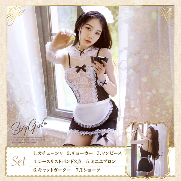 フリーサイズ セット内容:カチューシャ、チョーカー、ワンピース、レースリストバンド×2、ミニエプロン、キャットガーター、Tバックショーツ
